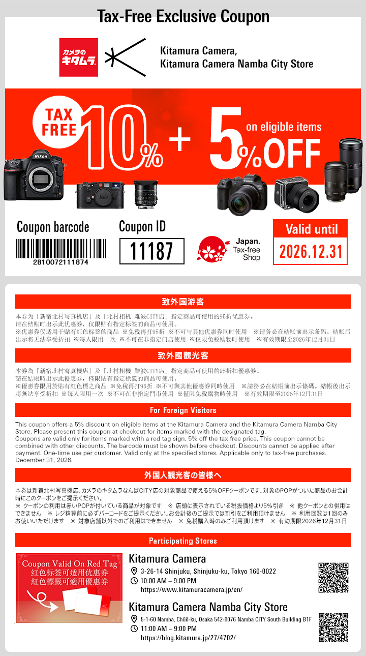 Founded in 1934, Kitamura Camera operates over 600 stores across Japan. Among them, the Shinjuku Kitamura Camera Store and Namba CITY Store serve as flagship locations, offering one of the largest selections of new and pre-owned cameras in the country.