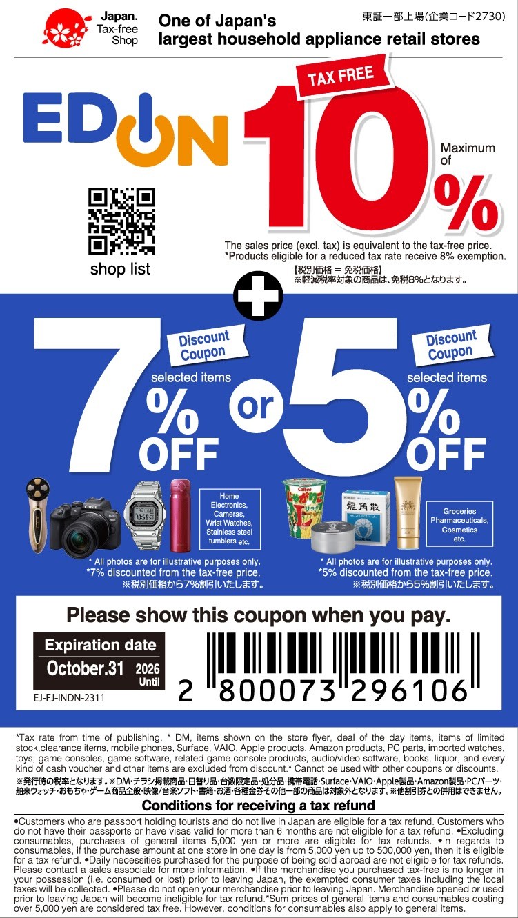 割引内容:免税 最大10% 対象商品 7% OFF