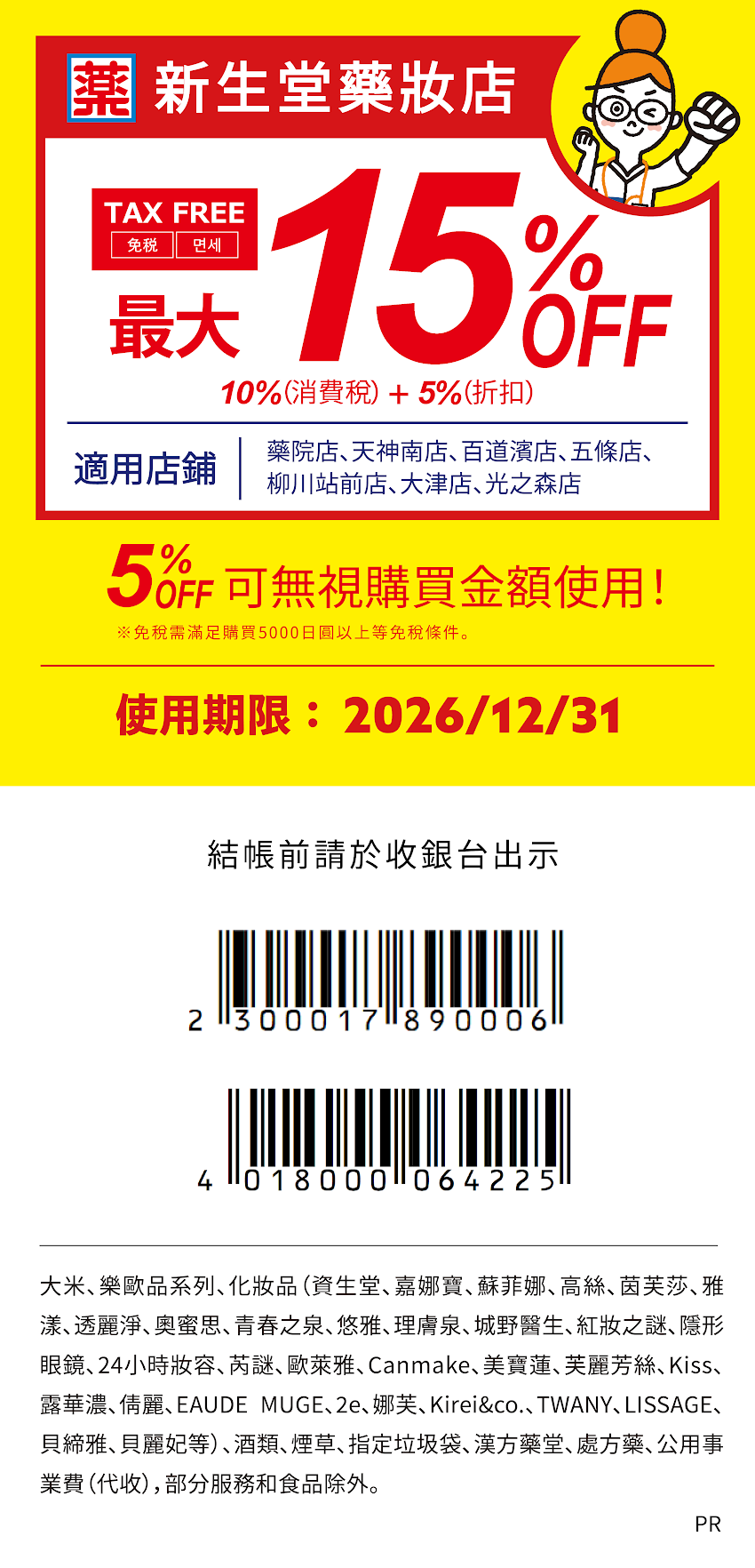 割引内容:10%免税+5%OFF (最低購入金額の制限なし、「薬院店、天神南店、ももち浜店、五条店、柳川駅前店、大津店、光の森店」の7店舗で利用可能)