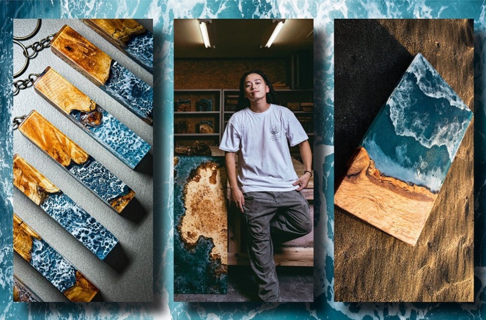 I’ve always loved surfing and even thought about becoming a shaper (a surfboard craftsman) in the future. There are many kinds of shapers, from those focused on competitions to classic craftsmen who still carve boards entirely by hand. I was fascinated by the classic ones. While I was watching videos of their work and creations, a wood resin video happened to play. At that moment, an image of a piece clearly came to mind.