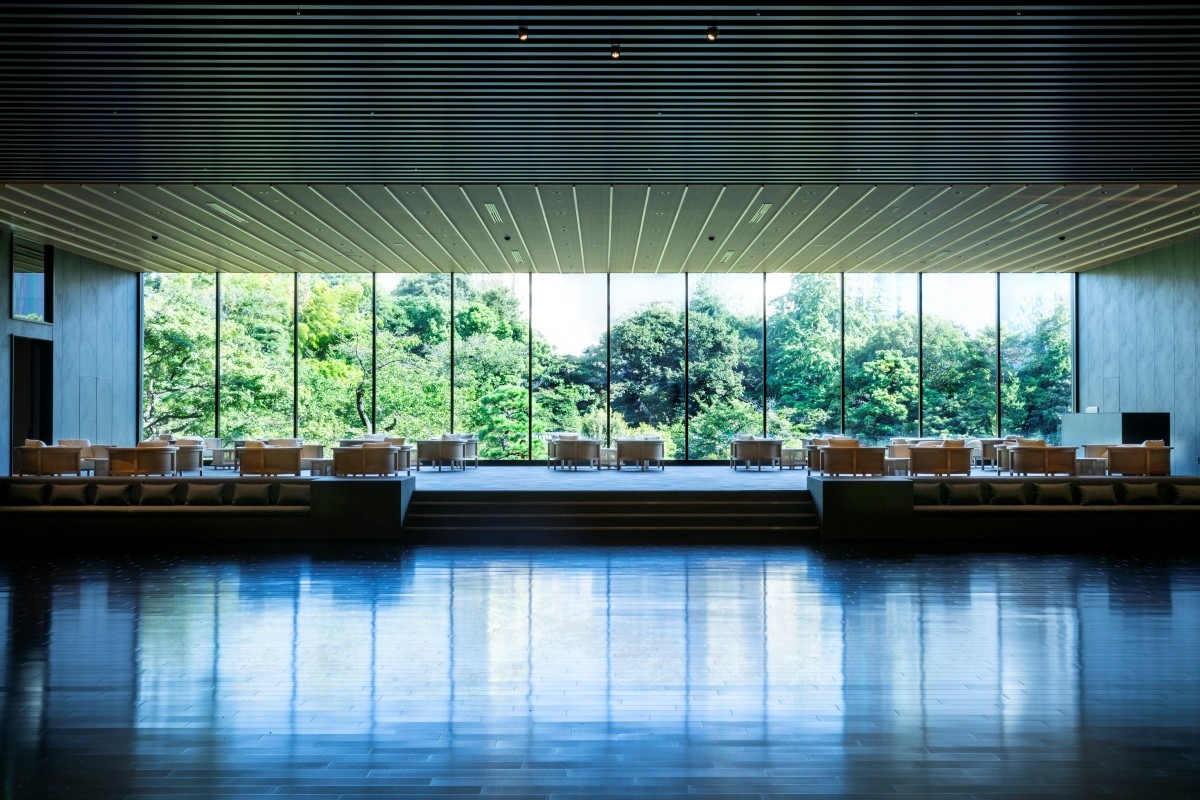 As you step into the newly renovated building, you’re greeted by a Japanese garden stretching out before you, visible through floor-to-ceiling glass. The lush greenery feels so close, you’re enveloped in a sense of openness, as if the garden and the interior are seamlessly connected.