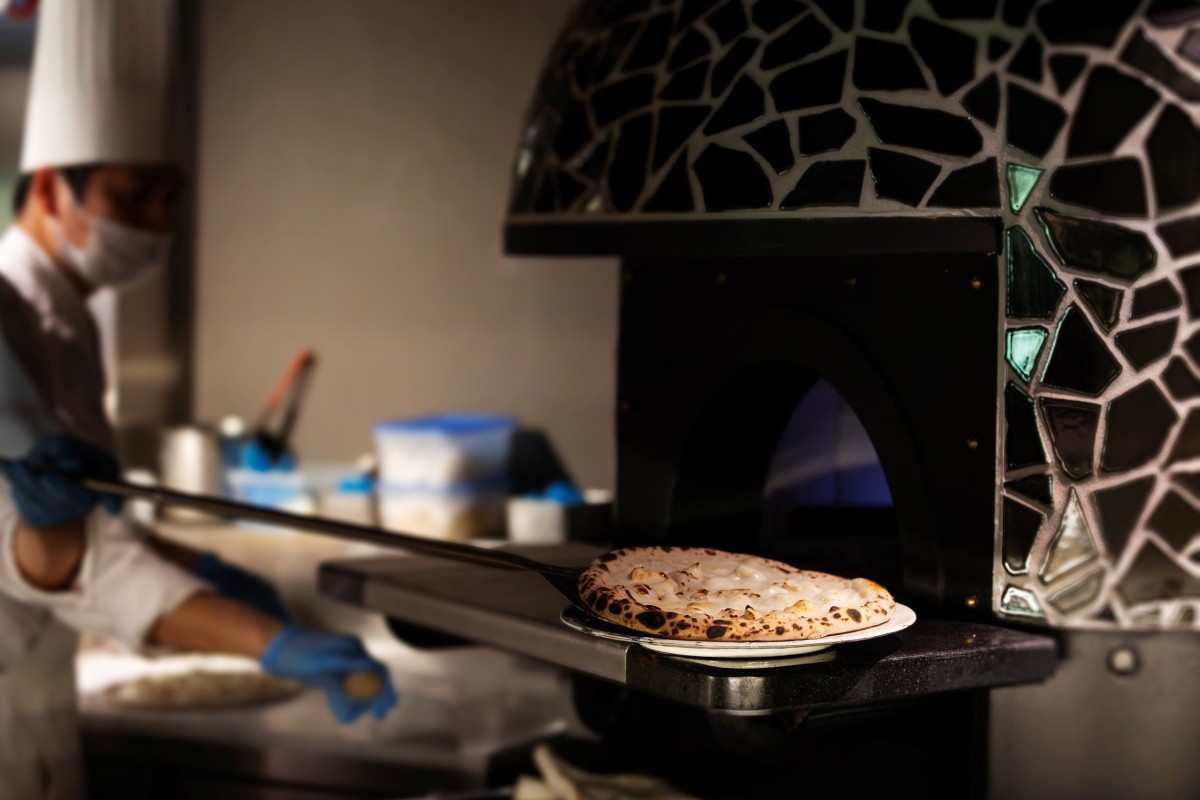 In addition to dishes that highlight farm-fresh vegetables and their signature “stone oven pizza,” the chef also creates spontaneous “one-day-only original menus” based on the ingredients delivered that day.