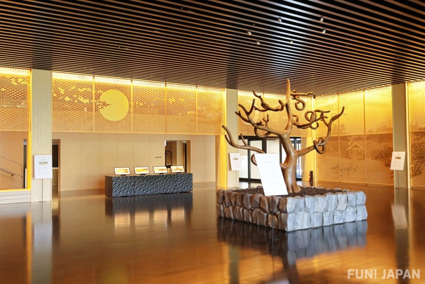 Standing opposite this view is a striking piece of kumiko art, reaching about four meters high. This magnificent design, which gives a modern twist to traditional Japanese woodworking techniques, brings a quiet presence to the space and naturally draws the eyes of all who visit.