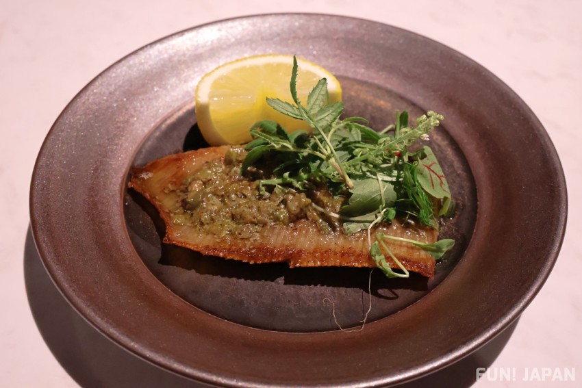 This dish features red stingray from Miyagi Prefecture, a rare find even for Japanese diners. As a cartilaginous fish, its bones are edible, offering a unique, pleasantly chewy texture. The moist flesh, rich in collagen, is complemented by a refreshing tapenade sauce made with olives and capers.