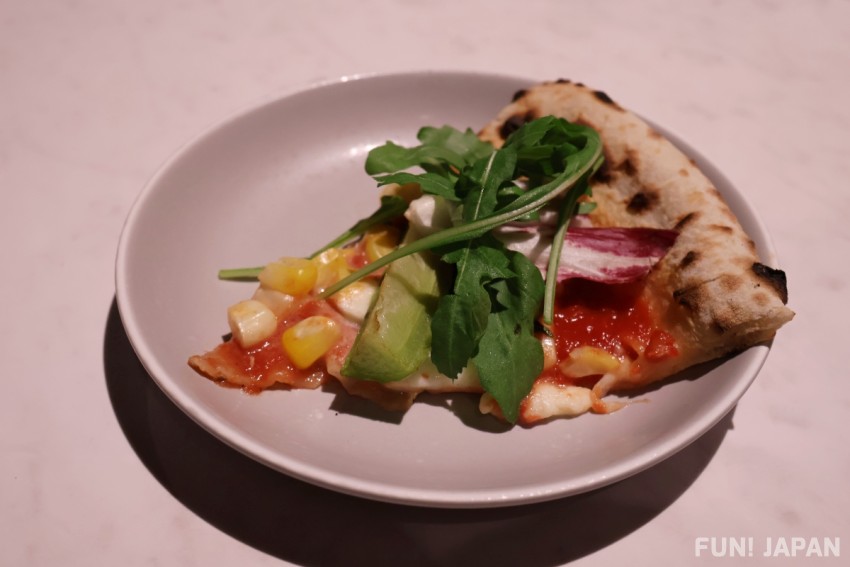 This Margherita pizza is generously topped with fresh vegetables delivered straight from the farm. After being baked in a stone oven, it’s finished with a heap of fresh leafy greens, creating a striking contrast between hot and cold, baked and raw, and different textures. Even the individual kernels of corn are delicious—this is a pizza unique to FUDO.