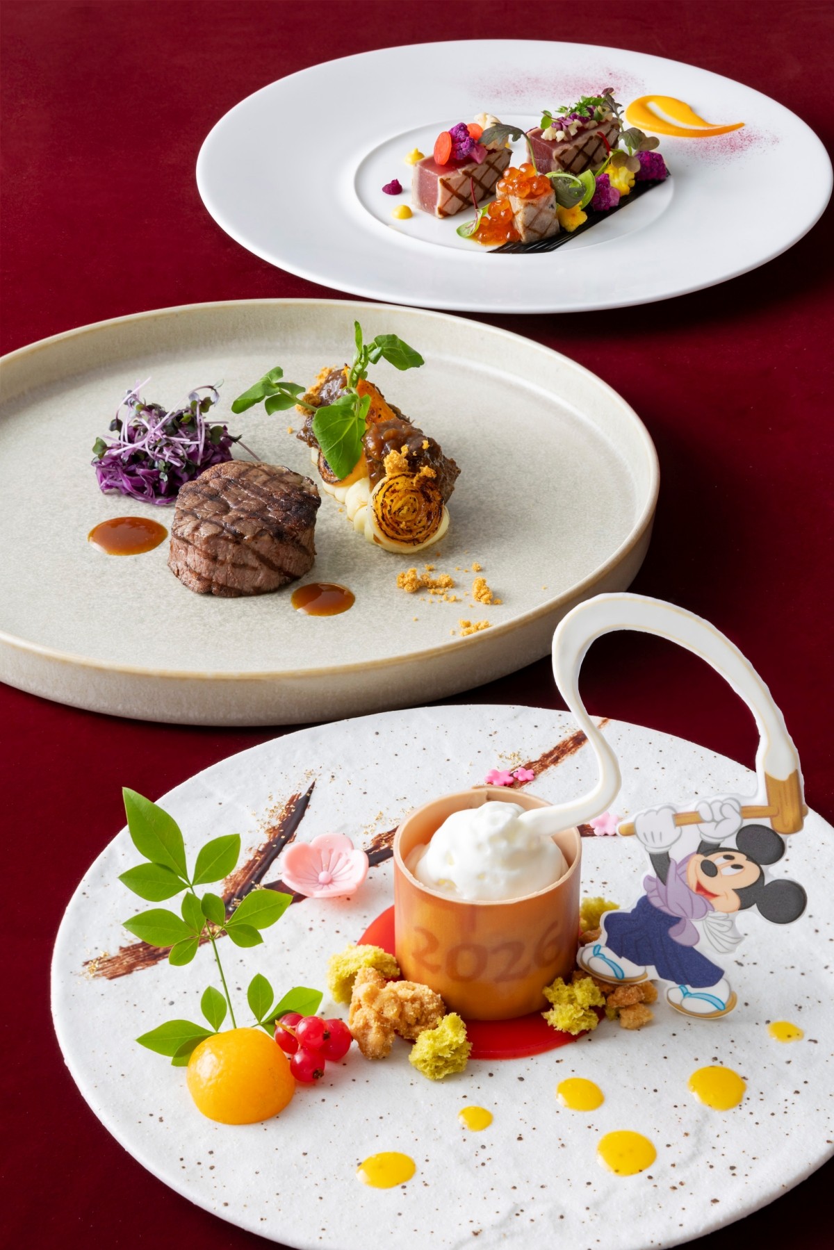 The "Year-End & New Year Special Dinner" (13,800 yen) includes desserts featuring Mickey Mouse motifs. The design, which looks as if Mickey is pounding mochi, is absolutely adorable!