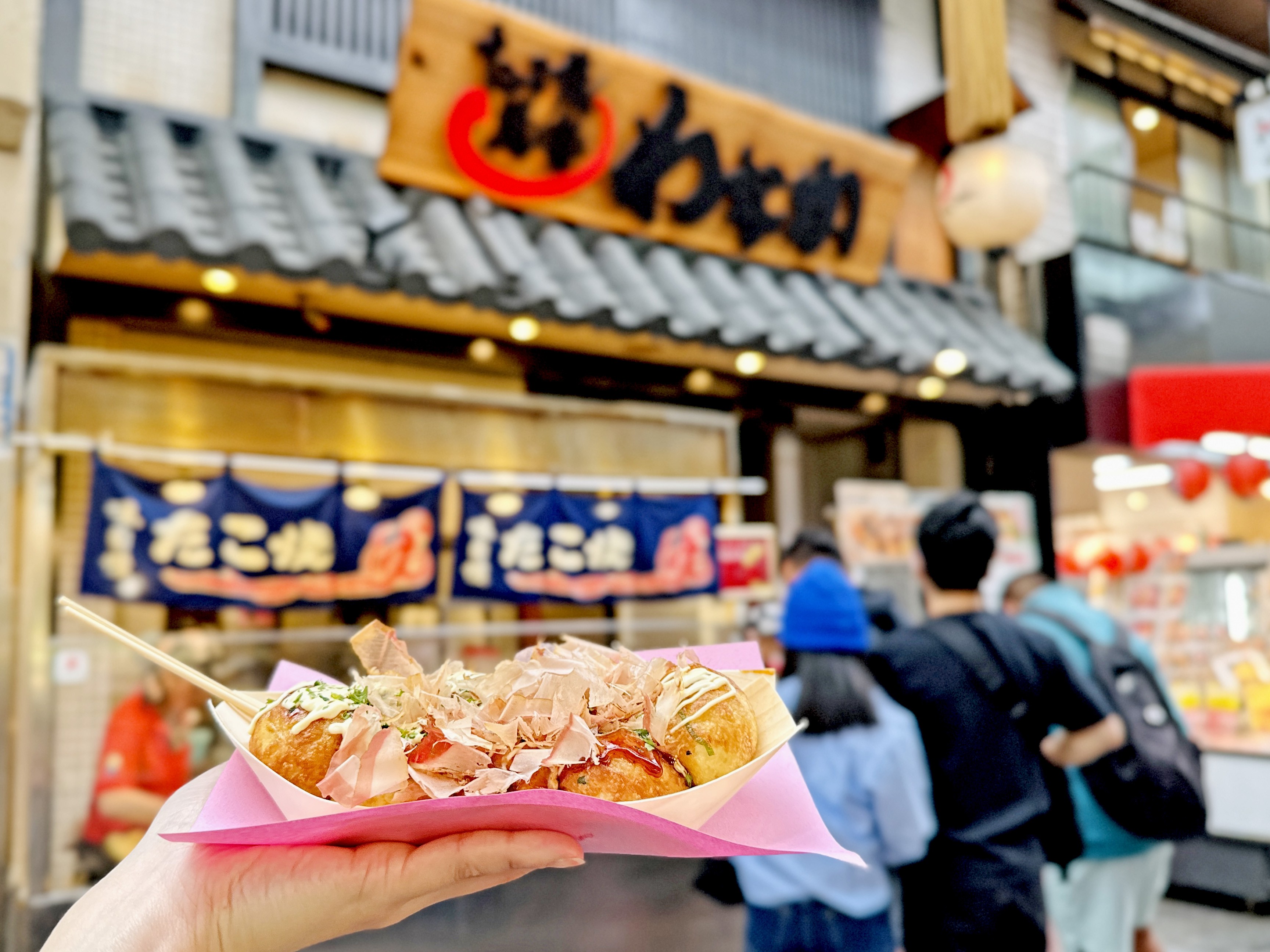 To really experience Osaka’s everyday food culture, don’t miss Wanaka, a long-standing favorite for takoyaki. Crispy on the outside, soft on the inside, and packed with tender chunks of octopus, these piping-hot bites are well worth the wait – even if there’s a line out front. If you’re craving something sweet, stop by Kuromon Mitoya, a popular fruit daifuku shop known for wrapping seasonal gems like strawberries and Shine Muscat grapes in smooth, delicate mochi. Each bite is juicy, lightly sweet, and incredibly satisfying without being overpowering. Kuromon Market is a food lover’s paradise, where every corner tempts you with another irresistible bite. It’s a must-visit for anyone who wants to eat their way through the city.