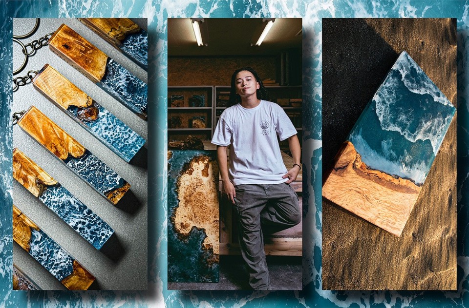 Sebenarnya, saya sangat menyukai surfing dan bercita-cita menjadi shaper (pembuat papan selancar) di masa depan. Ada berbagai tipe shaper, mulai dari yang berorientasi pada kompetisi hingga pengrajin klasik yang masih mengukir papan secara manual. Saya sendiri tertarik pada para pengrajin klasik. Saat saya menonton video mereka bekerja, secara kebetulan saya juga melihat video tentang wood resin. Saat itulah, gambaran karya yang ingin saya buat muncul dengan jelas di benak saya.