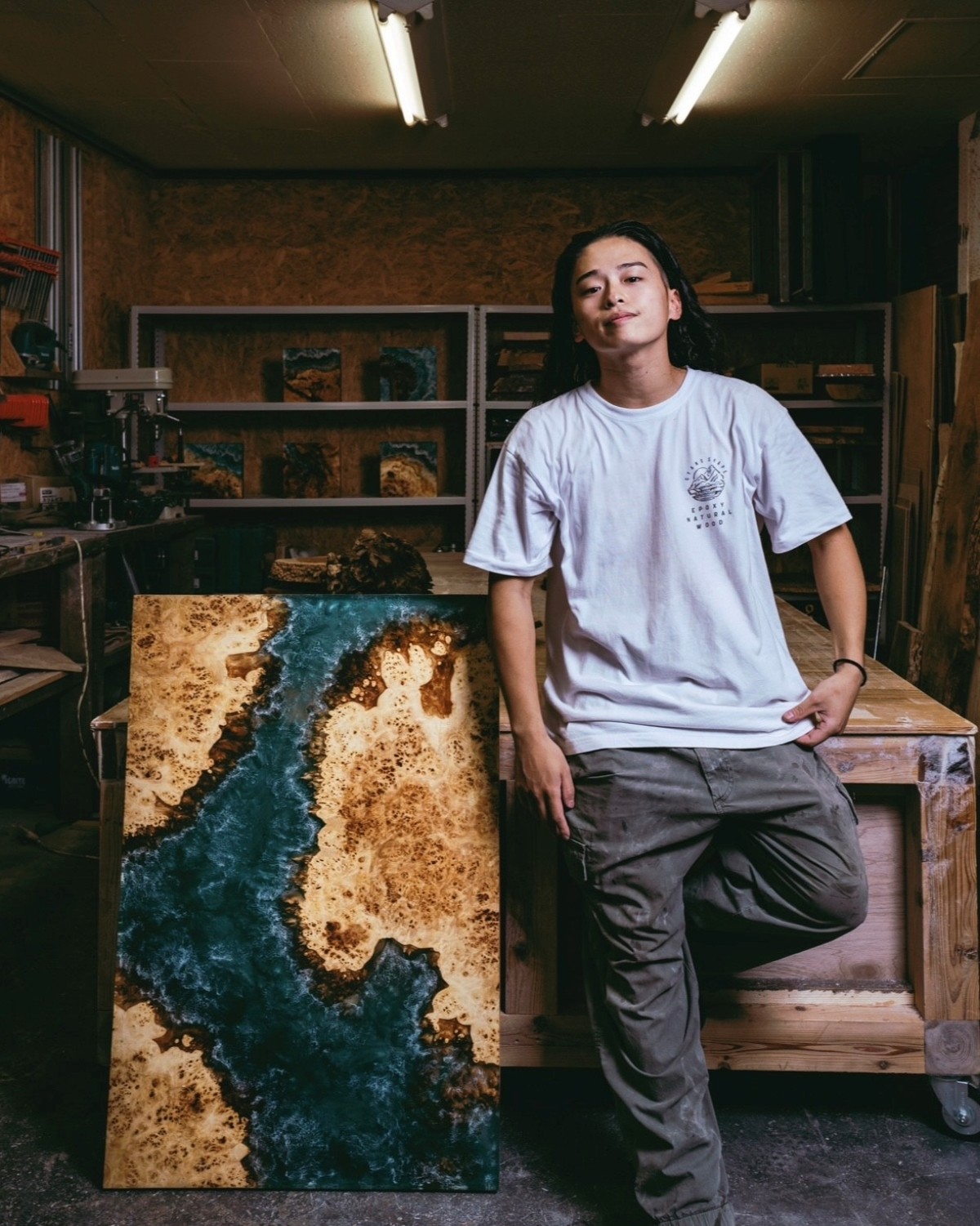 Pada waktu yang sama, saya juga mengenal dunia wood resin. Wood resin adalah karya seni yang menggabungkan kayu dan resin. Saya sangat terkesan dengan keindahan kayu berkualitas tinggi. Saya benar-benar terpikat, berpikir, "Ternyata ada benda sekeren ini."