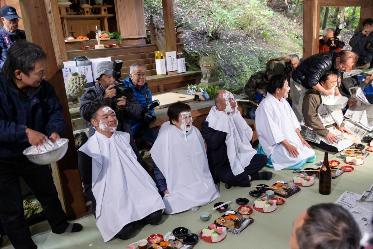 Oshiroi yang digunakan disebut "shitogi", yaitu bedak yang dibuat dari beras baru (hasil panen pertama) yang ditumbuk dan dicampur air. Para peserta yang merupakan warga lokal saling mengoleskan oshiroidi wajah satu sama lain, sambil berdoa untuk panen yang melimpah dan keselamatan keluarga. Dari ketebalan oshiroidi wajah, mereka juga meramalkan hasil panen tahun berikutnya.