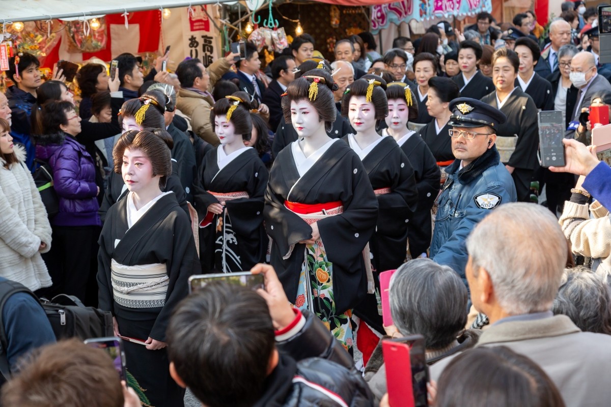 Salah satu acara yang paling menarik perhatian adalah "Kachi Mairi" yang diadakan pada tanggal 9. Geisha yang tergabung dalam Hakata Kenban berjalan perlahan di jalan menuju kuil sambil membawa payung Jepang merah, diiringi suara shamisen dan taiko, dan berziarah dengan berjalan kaki (kachi). Barisan mereka yang mengenakan kimono indah dan gerakan anggun benar-benar menjadi pemandangan khas Tahun Baru.