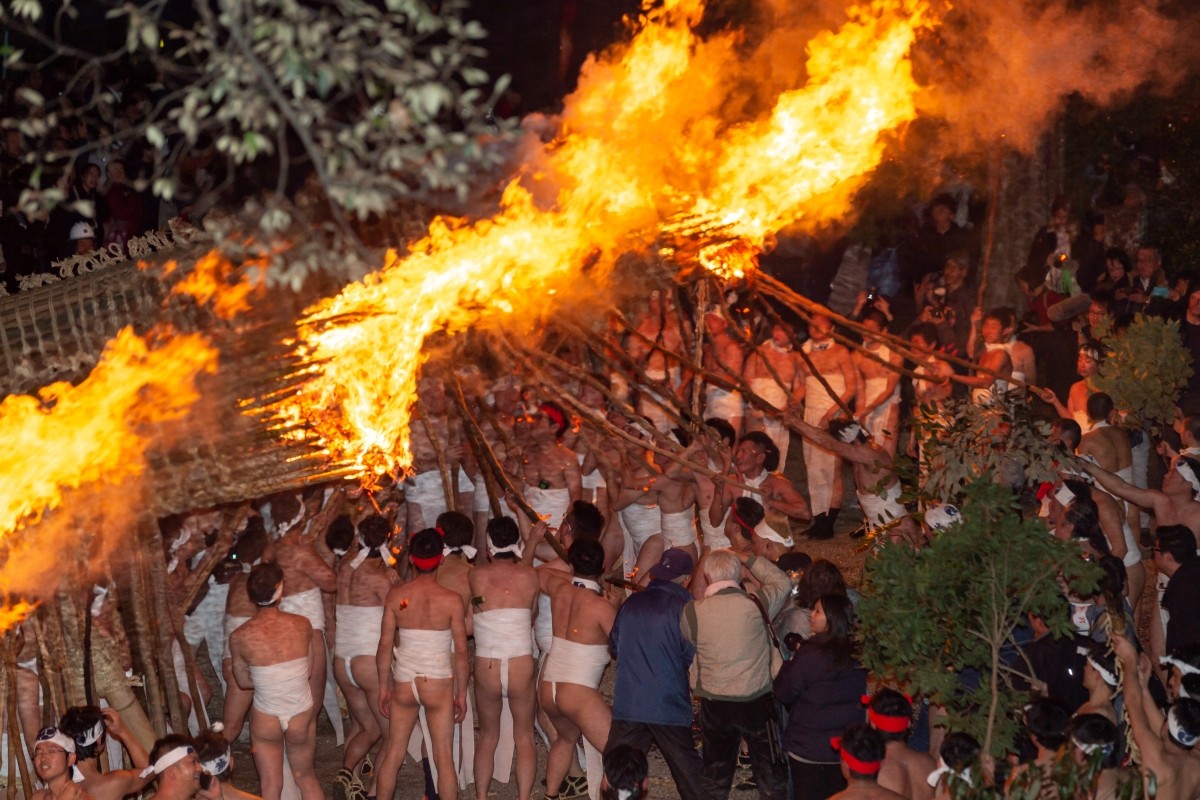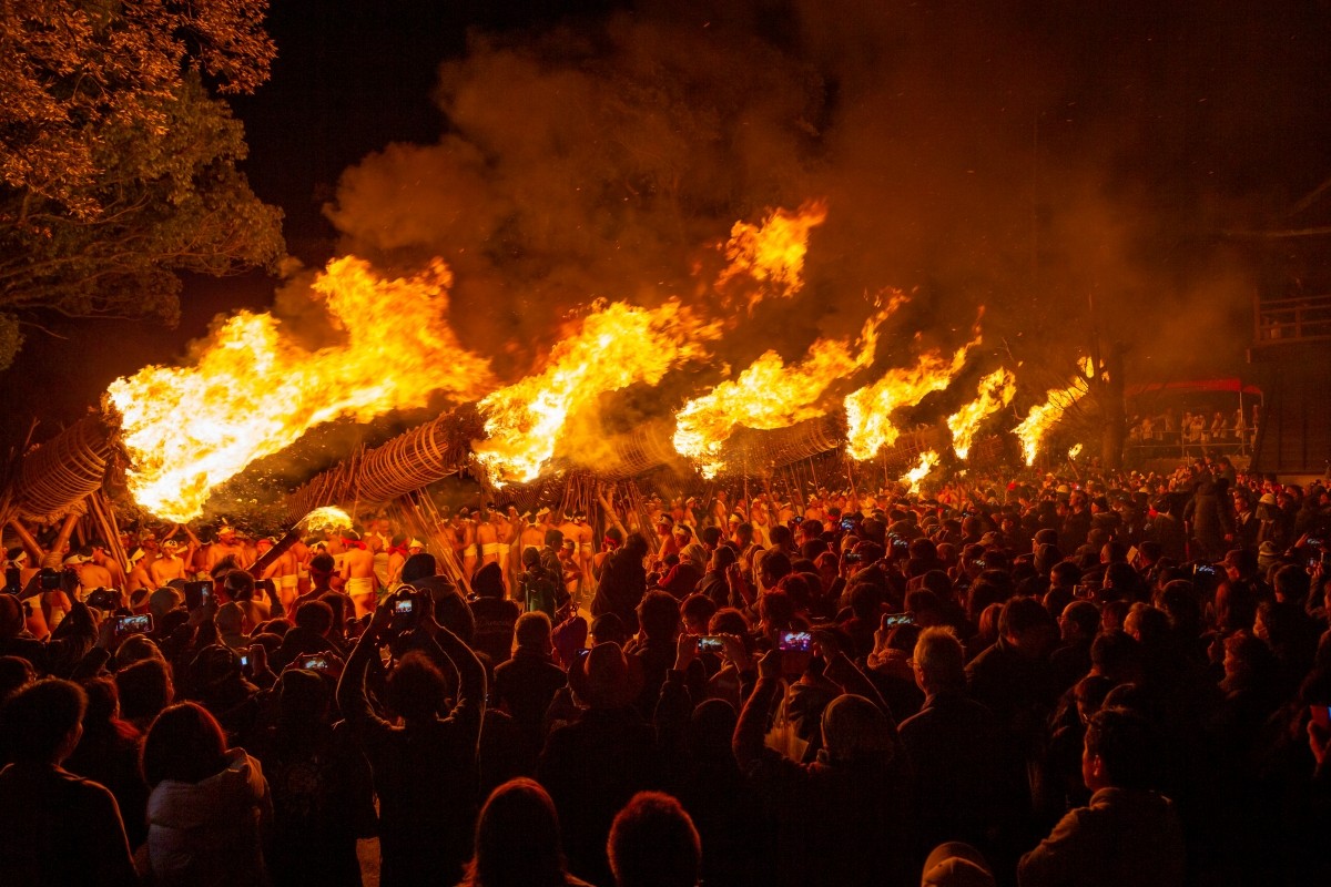 Yang paling menarik adalah enam obor raksasa yang dikatakan terbesar di Jepang. Obor sepanjang sekitar 13 meter dan berat 1 ton ini diarak keliling area kuil oleh ratusan pria berpakaian fundoshi. Api yang menyala-nyala dan teriakan para peserta menggema di langit malam, dan dipercaya bahwa mandi asap api ini akan membawa kesehatan, keselamatan keluarga, dan keberuntungan. Selain itu, pada pagi hari tanggal 4 Januari, kamu juga dapat menyaksikan proses pembuatan obor raksasa untuk persembahan.