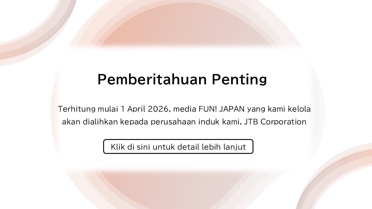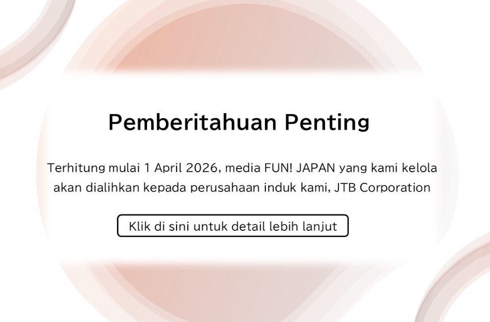 Demi meningkatkan kualitas layanan dan kepuasan para anggota, kami ingin memberitahukan bahwa media FUN! JAPAN yang saat ini dikelola oleh perusahaan kami akan dialihkan kepada perusahaan induk, yaitu JTB Corporation (※), terhitung mulai 1 April 2026.