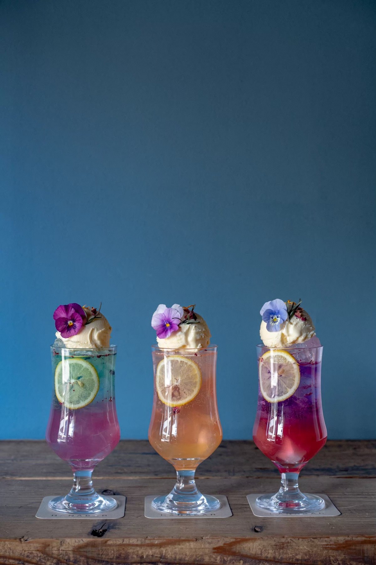 「HANABAR」は、ドライフラワーに囲まれた幻想的な空間が広がるカフェバーです。お花を使った色とりどりのマフィンや、カクテル、クリームソーダなどが揃い、推しカラーを選んで推し活を楽しめます。