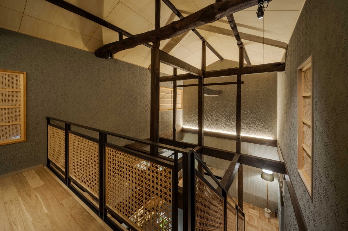 이 마치야의 하이라이트는 니시진오리 오비와 기모노를 조명과 쿠션 등으로 재탄생시킨 고급스러운 인테리어입니다. 교토 특유의 츠보니와 정원을 바라보는 다이닝 공간에는 최고급 니시진오리 오비의 히키하쿠 기법으로 만든 아트보드와 황동 패널이 우아함을 더합니다. 오픈 계단에는 화려한 오비 원단으로 만든 조명이 설치되어 화사한 분위기를 연출합니다.