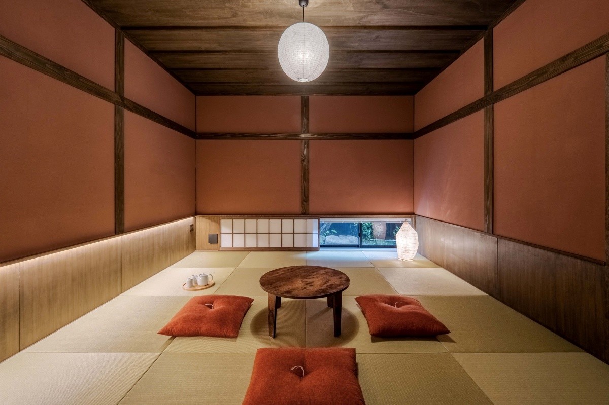 에도 시대 말기의 문인과 예술가들이 모였던 쇼고인 마을의 역사가 깃든 125㎡의 넓은 마치야 타운하우스를 프라이빗 렌탈로 이용할 수 있습니다. 전통적인 “다이베이즈쿠리”(大塀造) 양식의 담장으로 둘러싸인 매력적인 외관이 옛 분위기를 간직하고 있습니다. 입구에 들어서면 높은 천장과 식물 모티브로 장식된 주라쿠 벽이 있는 개방적인 공간이 펼쳐집니다. 1층에는 대형 테이블이 있는 거실·다이닝 공간과 흰 목련 아트로 꾸며진 소파 공간이 있어 우아하고 편안한 시간을 보낼 수 있습니다.
