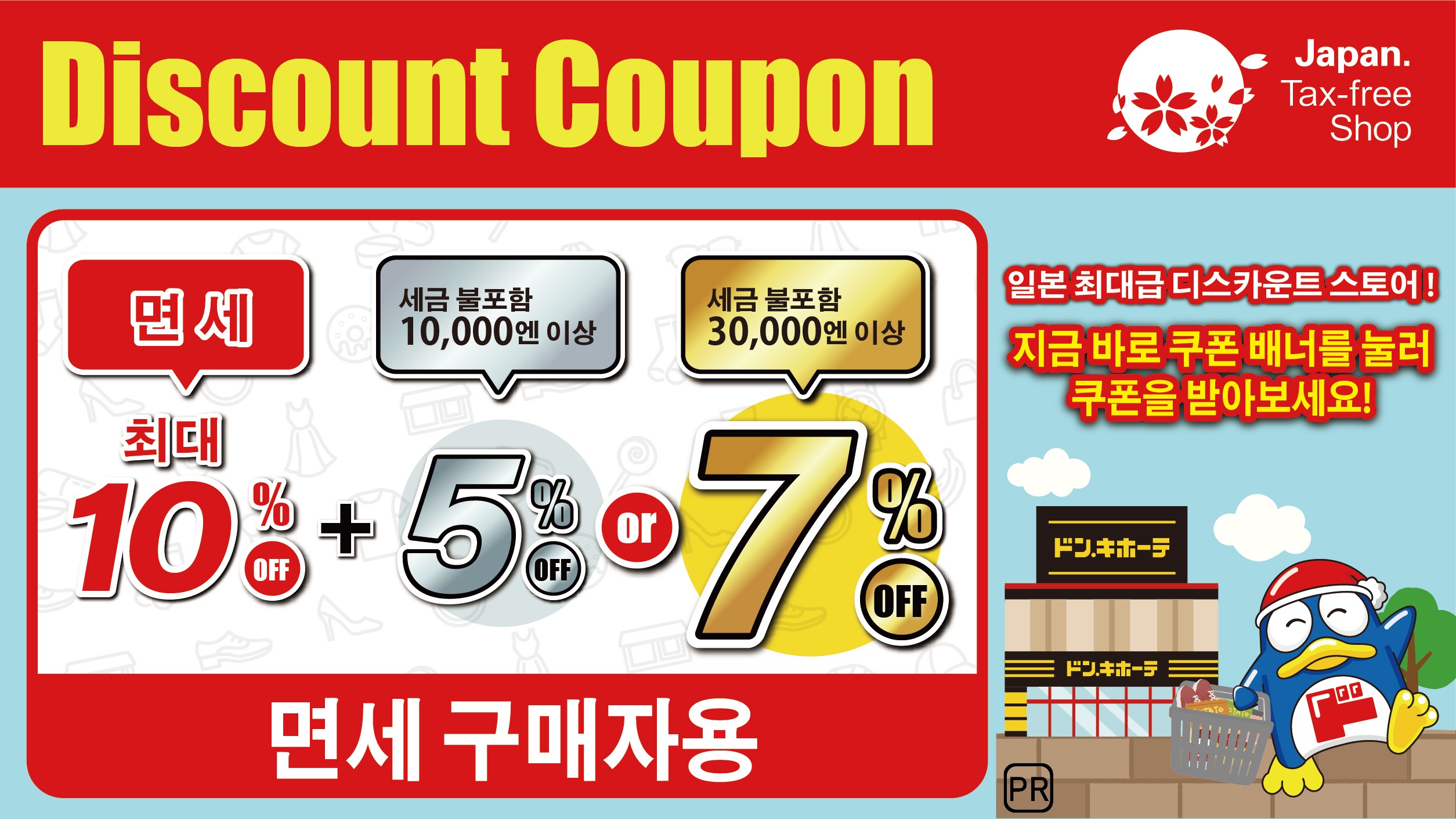 FUN! JAPAN에서는 일본을 방문하는 해외 관광객을 대상으로 전국의 돈키호테 매장에서 사용할 수 있는 특별 할인 쿠폰을 제공합니다. 아래 쿠폰을 터치하고 계산대에서 제시하면 10% 면세와 최대 7% 추가 할인을 받을 수 있습니다!