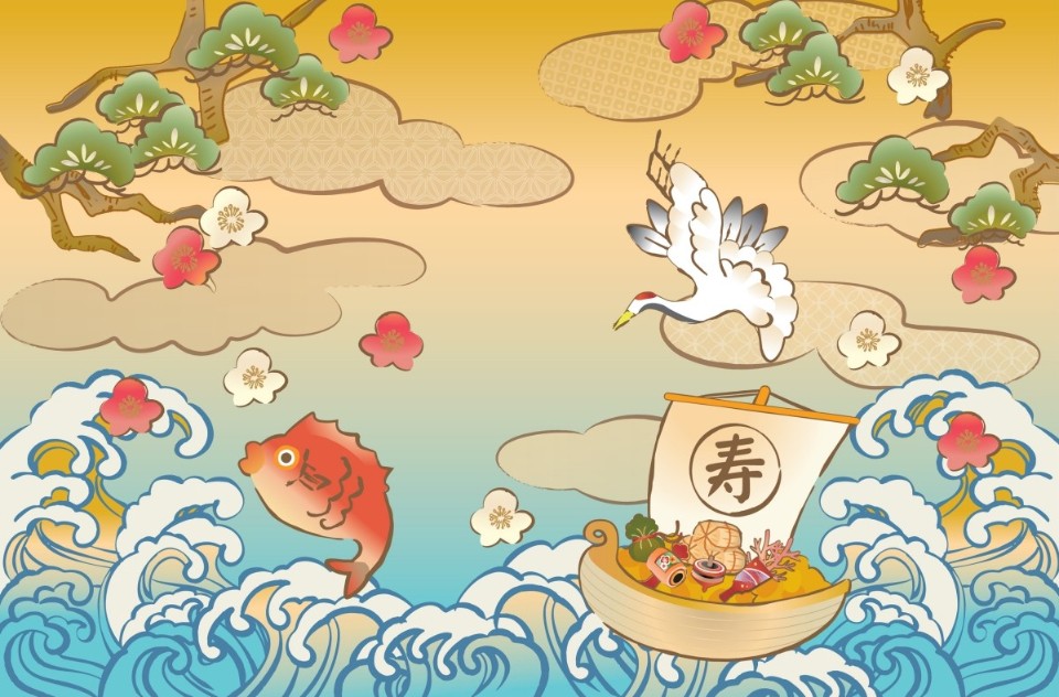 七位神明一起乘坐的「寶船」圖案,是能一次帶來大量幸福的最強幸運象徵。