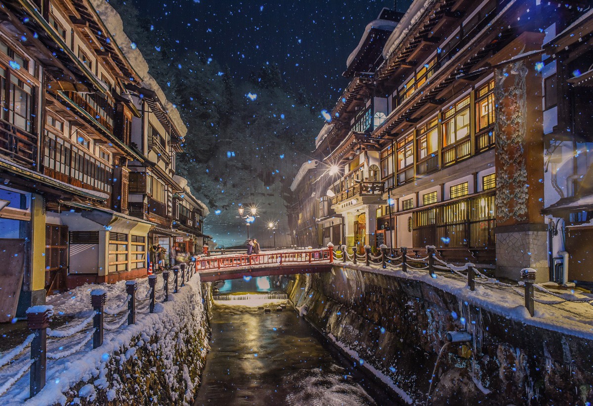 銀山溫泉位於山形縣尾花澤市,是一處以大正浪漫風情的木造旅館沿著河岸排列而聞名的溫泉地。每到冬天,整個溫泉街都被白雪覆蓋,瓦斯燈柔和的光線映照在雪地上,營造出彷彿穿越時空般的夢幻氛圍。