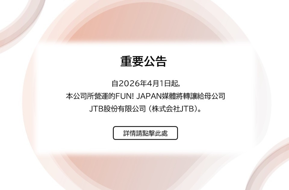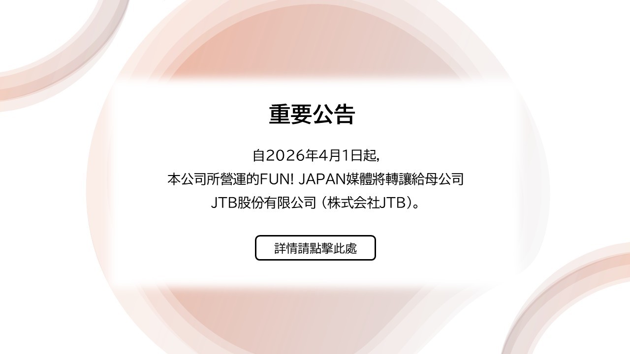 為了進一步提升服務品質並增進會員滿意度,敝公司所營運的FUN! JAPAN媒體,將於2026年4月1日轉讓給母公司JTB股份有限公司(※)。