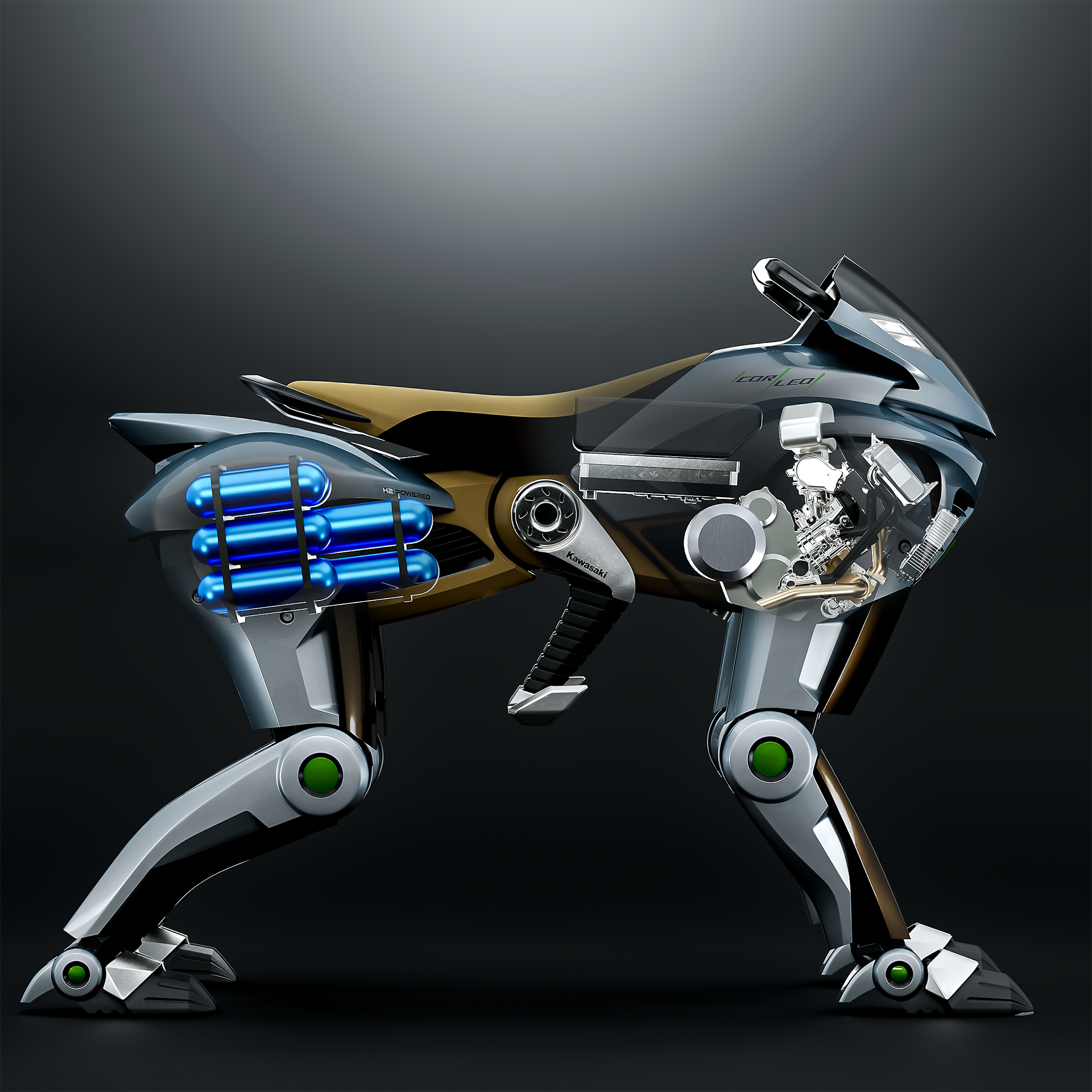 「CORLEO」最大特色在於追求「Kawasaki」的核心理念「Fun to Ride」。憑藉四腳機械結構展現的卓越越野性能,再加上車輛能即時感知騎士動作,實現了人機合一的安全感與駕馭樂趣。透過「CORLEO」的開發,那些曾僅存於電影與遊戲、人類在壯麗的大自然中自由奔馳的未來場景,化為觸手可及的現實。