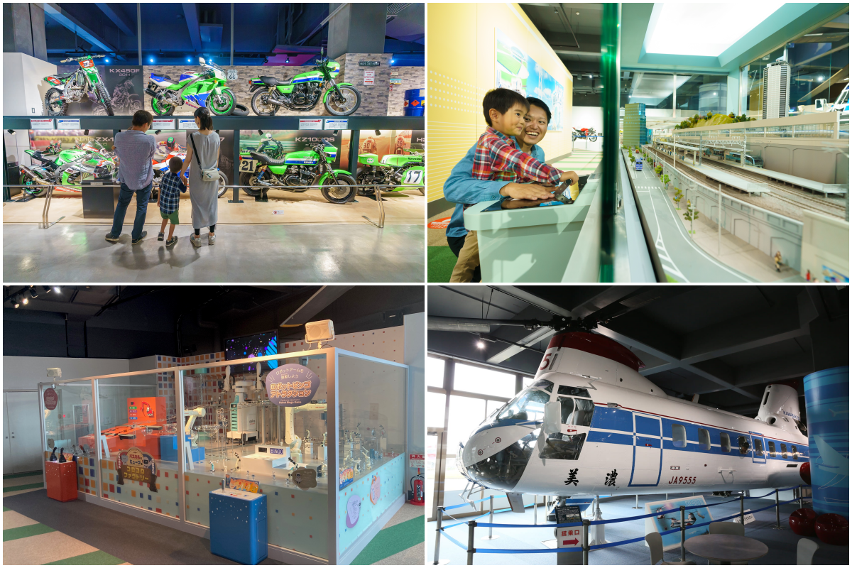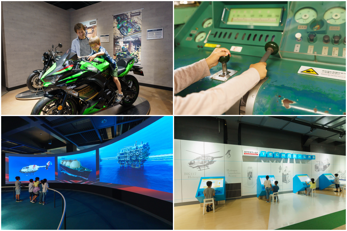 首先,展示包含賽車在內的歷代「Kawasaki」實車,有些車輛可供「試乘」,可親身感受機械的震動。其次,可以進入0系新幹線的第一節車廂,實際「觸碰」車廂內部與駕駛座。再來就是可在配備寬曲面螢幕的劇院裡,透過震撼的影像,「觀賞」自由穿梭在陸、海、空的各類產品。最後,與各具個性的角色一同「學習」交通工具、能源設施與產業機械的運作原理。