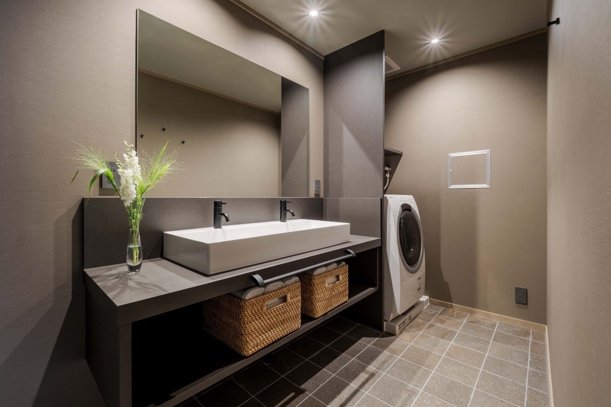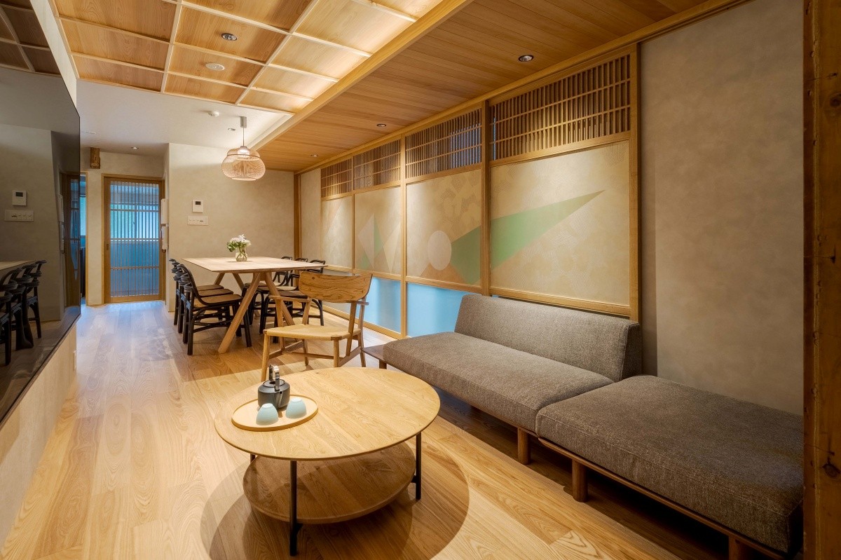 Một căn nhà machiya rộng rãi 125m² cho thuê nguyên căn, nơi vẫn còn lưu giữ lịch sử của làng Shogoin, nơi các văn nhân và nghệ sĩ cuối thời Mạc mạt từng tụ họp. Ngoại thất ấn tượng với bức tường lớn mang dấu ấn kiến trúc truyền thống "Ohei-zukuri". Bước vào cửa, không gian mở với tường Juraku được chạm khắc họa tiết cây cỏ tạo cảm giác thoáng đãng. Tầng 1 là phòng khách và phòng ăn với bàn lớn, khu vực sofa được trang trí bằng nghệ thuật mộc lan trắng, mang đến những khoảnh khắc thanh lịch.