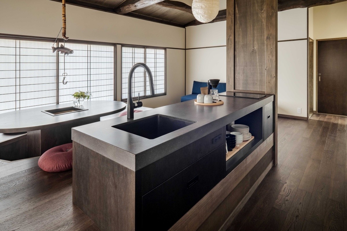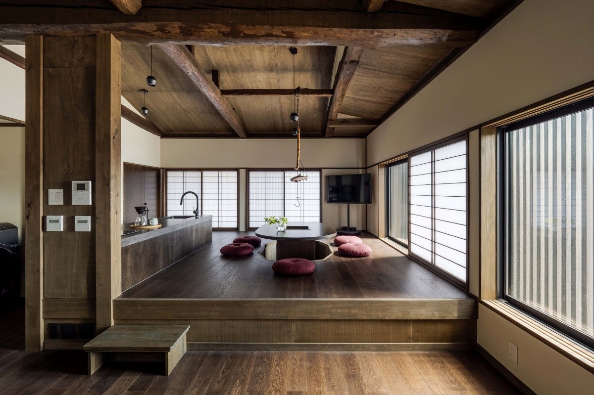 Điểm nổi bật là phòng khách và phòng ăn ở tầng 2 với bàn irori kiểu hori kotatsu và sofa, tạo không gian thư giãn. Không gian mở với bếp mở ở trung tâm, nơi bạn có thể vừa nấu ăn vừa trò chuyện. Trần nhà cao vẫn giữ lại các dầm gỗ himekomatsu nguyên bản của machiya, mang lại cảm giác về truyền thống của machiya ở Takayama.