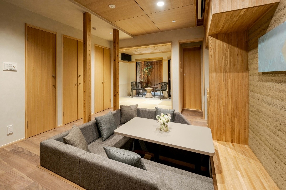 Phòng khách và phòng ăn với sofa kiểu horigotatsu mang lại không gian ấm cúng, được trang bị máy chiếu màn hình lớn. Phòng tắm có bồn tắm ngoài trời cho cảm giác như onsen ngoài trời, ngoài ra còn có phòng xông hơi riêng, giúp bạn thư giãn cả thể chất lẫn tinh thần (cần đặt gói có sauna). Nếu đặt cùng căn machiya bên cạnh "Tokisora", có thể ở tối đa 12 người, rất phù hợp cho nhóm đông hoặc gia đình lớn.