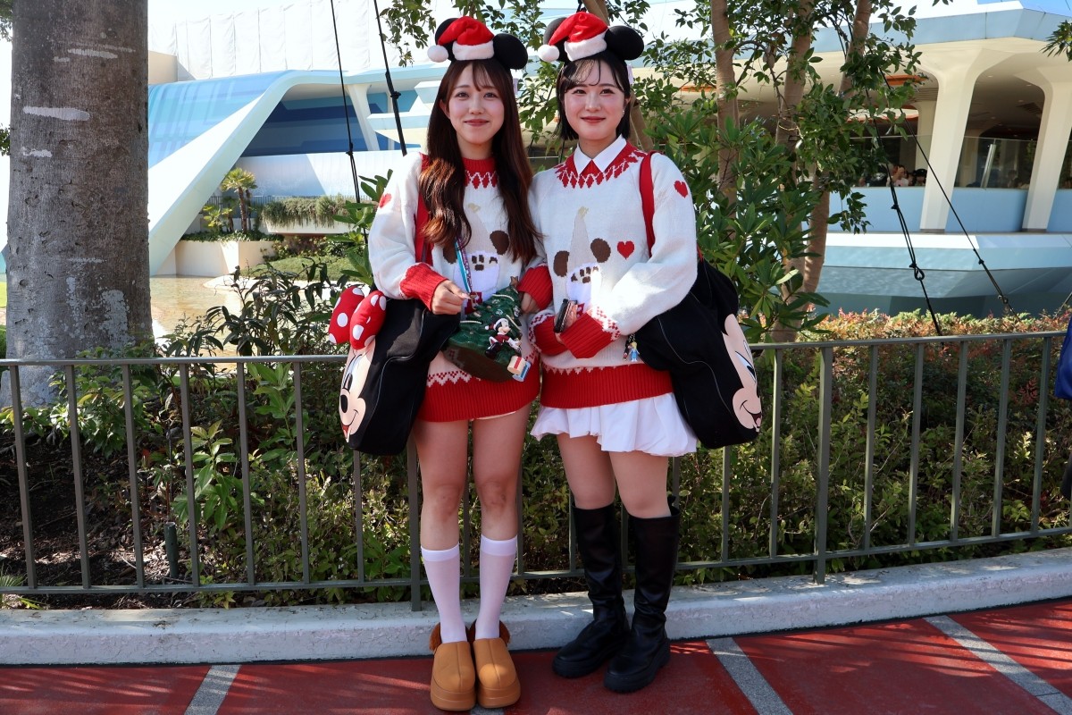Trong thời gian Giáng Sinh tại Tokyo Disneyland, bạn sẽ thấy rất nhiều outfit mang màu sắc Giáng Sinh như đỏ, xanh lá, trắng, các phụ kiện len, băng đô phiên bản giới hạn,... tạo nên không khí mùa lễ hội. Đặc biệt, có rất nhiều nhóm bạn nữ diện đồ đôi hoặc phối đồ theo concept cùng nhau.