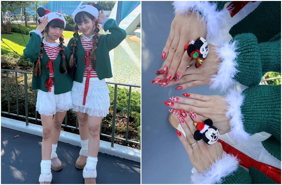 Hai bạn nữ này nổi bật với mũ ông già Noel có tai Mickey Mouse, nhẫn Mickey Mouse và Minnie Mouse làm điểm nhấn. Nếu nhìn kỹ, bạn sẽ thấy cả nail sticker hình Mickey Mouse và Minnie Mouse trên móng tay, thể hiện sự chăm chút đến từng chi tiết nhỏ!