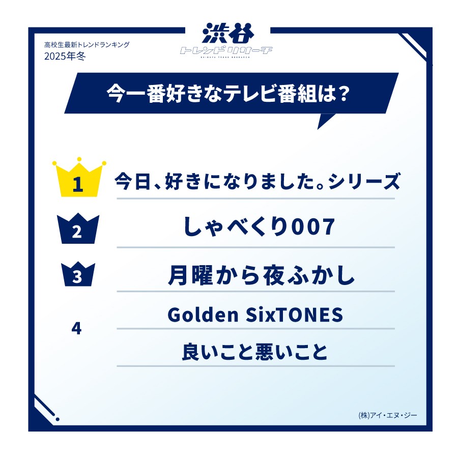 "今日好き", viết tắt của chương trình nổi tiếng trên ABEMA "今日、好きになりました。" ("Hôm nay, tôi đã phải lòng"), lần đầu tiên đứng đầu bảng xếp hạng này. Sau khi xếp thứ ba vào mùa hè, độ nổi tiếng của chương trình chỉ ngày càng tăng. Nhiều bình luận như "Đó là điều mình mong chờ mỗi thứ Hai" (nữ sinh lớp 11), và "Ai cũng xem chương trình này" (nữ sinh lớp 12), cho thấy "cơn sốt Kyo Suki" đang ngày càng lan rộng.