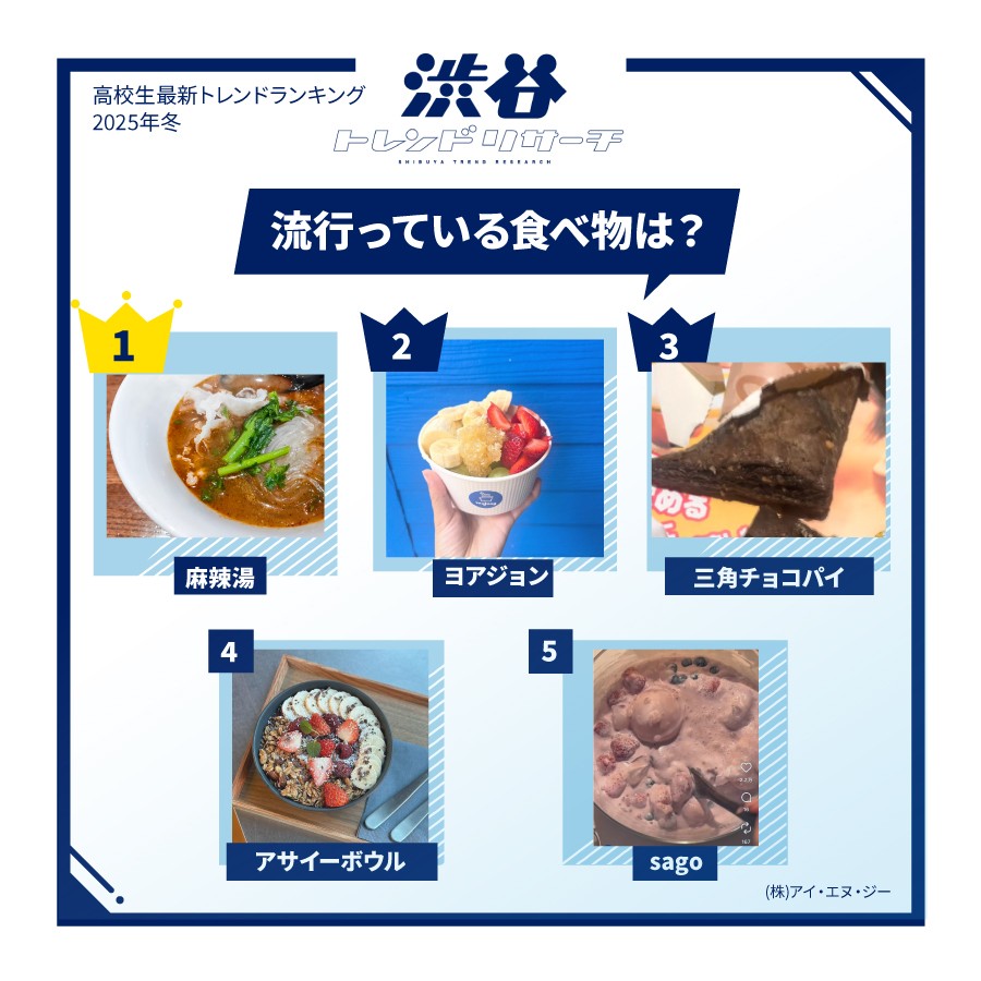 Đứng thứ hai là “YOAJUNG”, lần đầu tiên xuất hiện. Đây là món tráng miệng Hàn Quốc gồm kem sữa chua phủ trái cây, ngũ cốc, các loại hạt, mật ong, sôcôla và nhiều topping khác. Nhiều bình luận như “Có nhiều cửa hàng mới mở hơn” (nữ sinh lớp 11) và “Mình đã thử ở Shin-Okubo và thấy rất ngon” (nữ sinh lớp 12) cho thấy món này đang nhanh chóng trở nên phổ biến, đặc biệt là trong giới nữ sinh cấp ba.