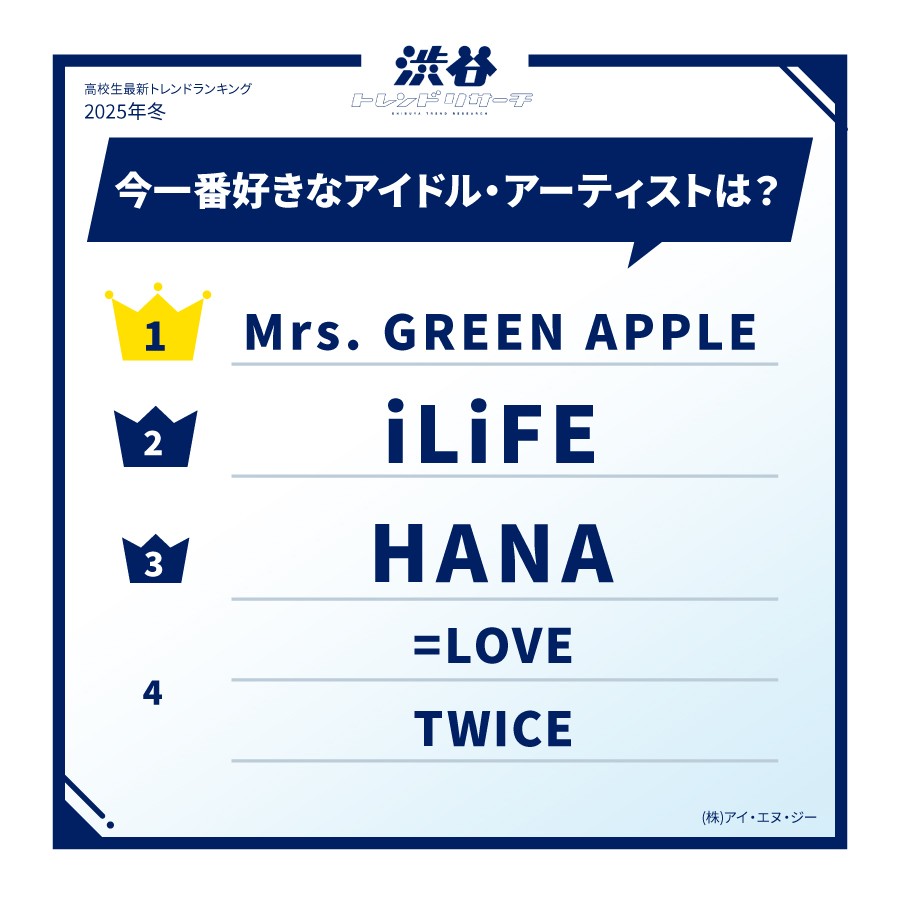 Một lần nữa, “Mrs. GREEN APPLE” đã giành vị trí đầu bảng. Nhiều bình luận như “Âm nhạc của họ đã cứu rỗi tôi” (nam sinh năm nhất cấp 3) đã được gửi về, cũng như “Theo dõi họ rất vui, với nhiều hoạt động giải trí như bắt đầu Giai đoạn 3 từ đầu năm” (nữ sinh năm ba cấp 3). Sự nổi tiếng của họ không chỉ đến từ âm nhạc mà còn nhờ xuất hiện trong các bộ phim truyền hình và chương trình tạp kỹ.