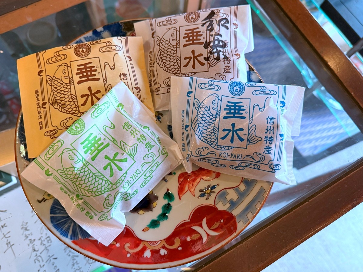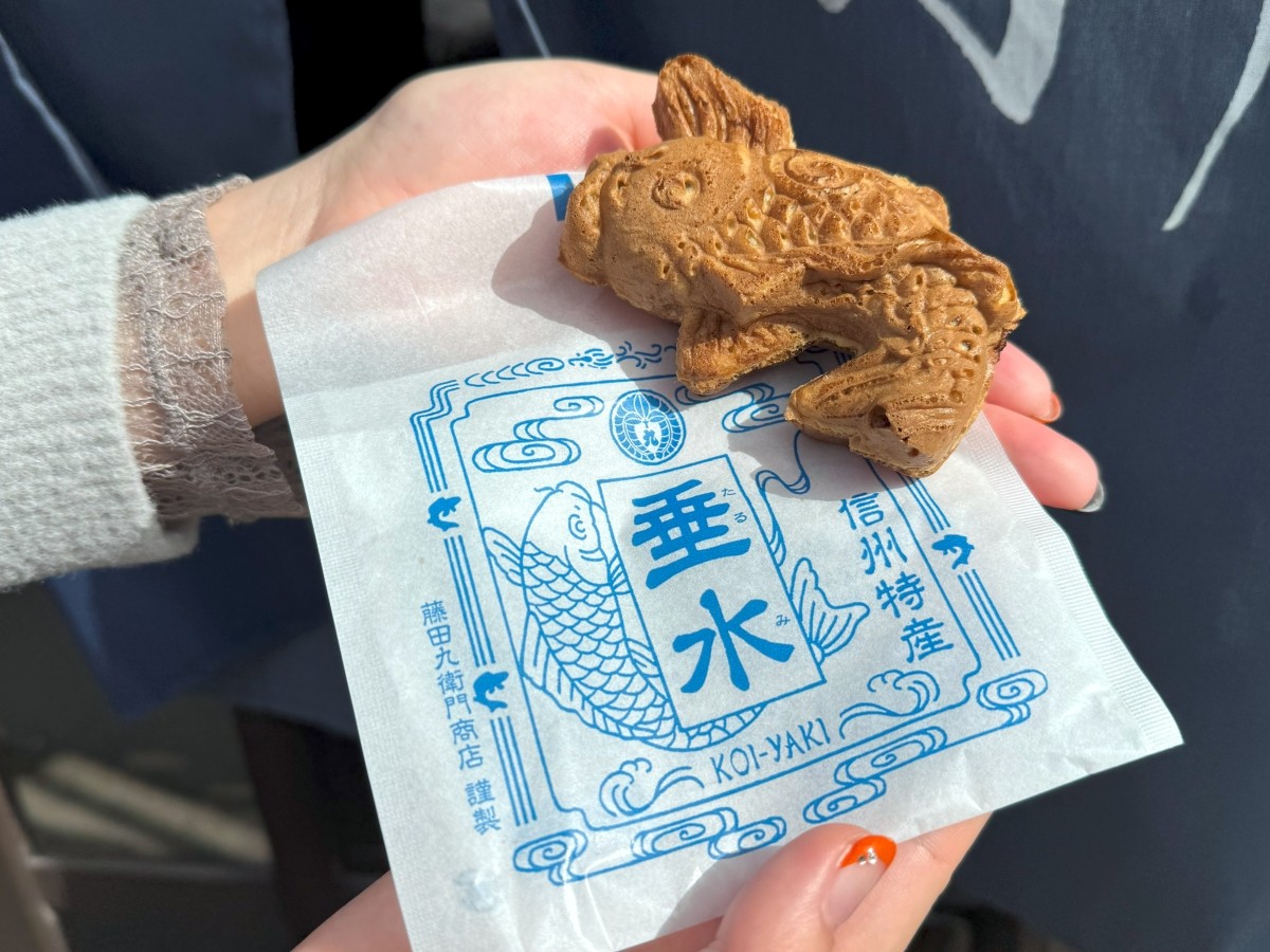 Tại khu vực miền núi Shinshu, tỉnh Nagano, người ta từng ăn cá chép trong các dịp lễ hội. Vì vậy, tại “Fujita Kuemon Shoten”, thay vì bánh taiyaki hình cá tráp, họ bán “Koi-yaki” – bánh hình cá chép. Koi-yaki cỡ lòng bàn tay, bên trong đầy ắp nhân đậu hoa tím trồng tại Shinshu.